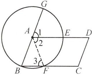 解:∵□ABCD ∴∠2=∠3=∠B 又∵∠1=∠B ∴∠1=∠2 ∴$\overset{\frown}{GE}=\overset{\frown}{EF}$