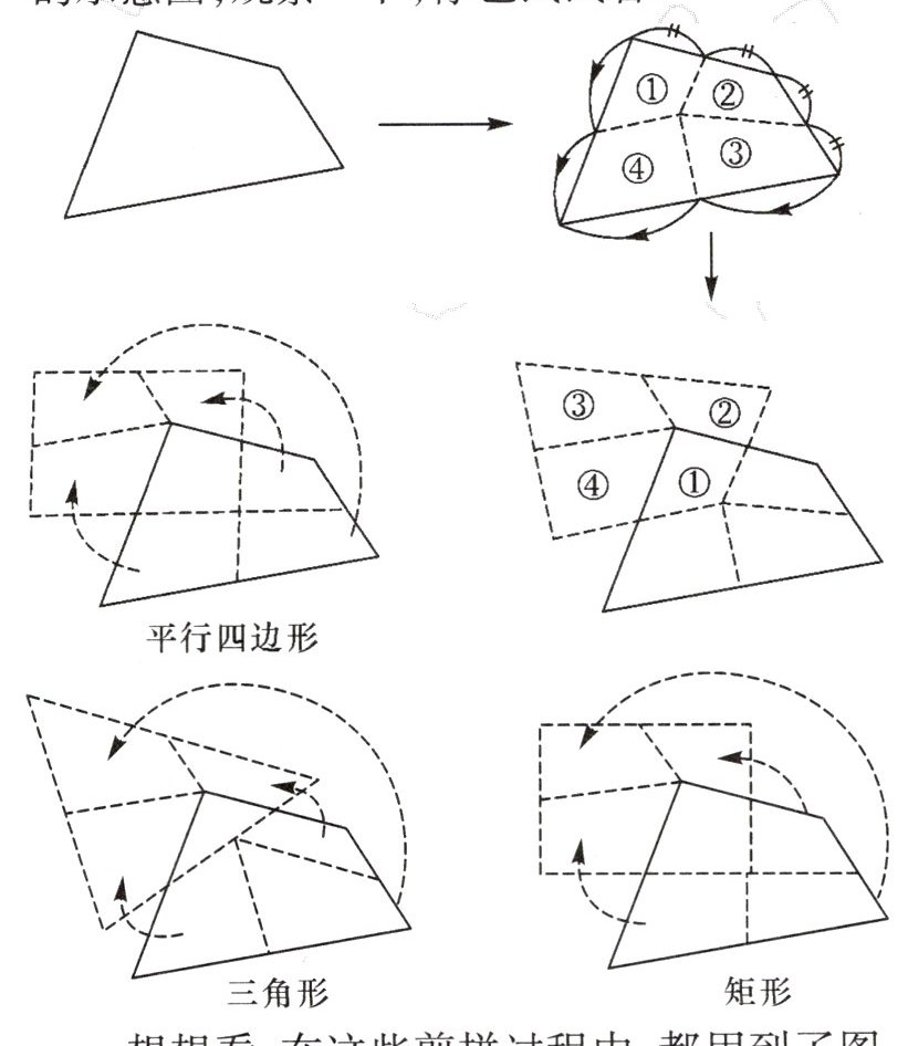 那么任意一个四边形呢?它也可以剪开拼成各种各样的图形.下面给出了一些剪拼的示意图,观察一下,你也试试看.