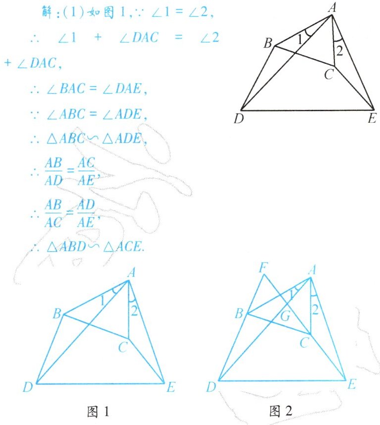 例4 如图,已知△ABC和△ADE,连接BD,CE,∠1=∠2,∠ABC=∠ADE.