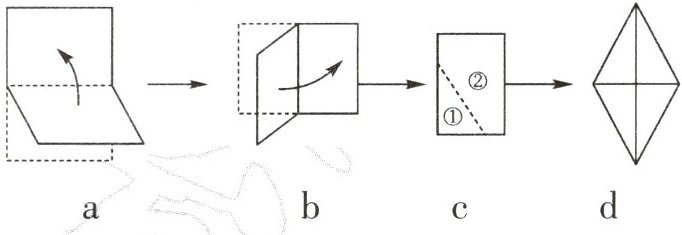 取一张长方形纸片,按照下面的方法对折两次,并沿图c中的斜线(虚线)剪开,把剪下的①部分展开,平铺在桌面上.