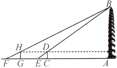 ,在地面上的$C$处垂直于地面竖立了高度为2米的标杆$CD$,这时地面上的点$E$、标杆的顶端点$D$、舍利塔的塔尖点$B$正好在同一直线上,测得$EC=4$米;将标杆$CD$向后平移到点$G$处,这时地面上的点$F$、标杆的顶端点$H$、舍利塔的塔尖点$B$正好在同一直线上(点$F,G,E,C$与塔底处的点$A$在同一直线上),这时测得$FG=6$米,$GC=53$米.请你根据以上数据,计算舍利塔的高度$AB$.