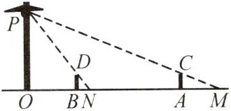 ,路灯($P$点)距地面8米,小明在距路灯的底部($O$点)20米的$A$点时,测得此时他的影长$AM$为5米.(1)求小明的身高.(2)小明沿$OA$所在的直线行走14米到$B$点时,身影的长度是变长了还是变短了?变长或变短了多少米?