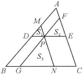 如图,DE//BC,FG//AB,MN//AC,且DE,FG,MN交于点P.记$S_{△DPM}=S_{1},S_{△PEF}=S_{2},S_{△GNP}=S_{3},S_{△ABC}=S,$那么S与$S_{1},S_{2},S_{3}$之间有何关系?猜想并加以验证.