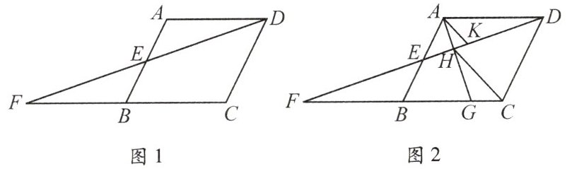 例2 如图1,在□ABCD中,E是AB的中点,连接DE并延长,交CB的延长线于点F.(1)求证:△ADE≌△BFE.(2)如图2,G是边BC上任意一点(点G不与点B,C重合),连接AG,交DF于点H,连接HC,过点A作AK//HC,交DF于点K.①求证:HC=2AK;②当点G是边BC的中点时,求$\frac{HD}{HF}$的值.