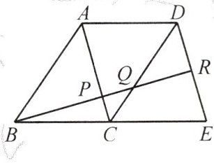 解:∵四边形ABCD和四边形ACED都是平行四边形,∴BC=AD=CE,AC//DE,∴△PBC∽△RBE,∴$\frac{PB}{PR}=\frac{BC}{CE},\frac{PC}{RE}=\frac{BC}{BE}=\frac{1}{2},$∴RB=2PB,∵点R为DE的中点,△PCQ∽△RDQ,∴$\frac{PQ}{QR}=\frac{PC}{DR}=\frac{PC}{RE}=\frac{1}{2},$∴QR=2PQ,∵BP=PR=PQ+QR=3PQ,∴BP:PQ:QR=3:1:2.