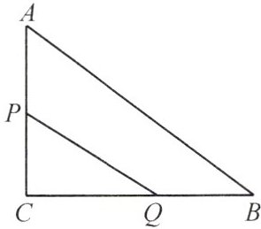由题意得,$AP = x\ cm$,$BQ = x\ cm$,则$PC = (6 - x)\ cm$,$QC = (8 - x)\ cm$。