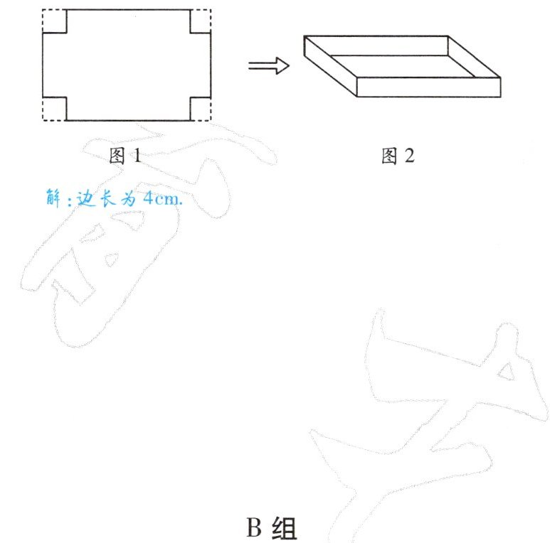 5. 一张长30 cm、宽20 cm的矩形纸片,如图1所示,将这张纸片的四个角各剪去一个边长相同的正方形后,把剩余部分折成一个无盖的长方体纸盒,如图2所示. 如果折成的长方体纸盒的底面积为$264\ cm^2$,求剪掉的正方形纸片的边长.