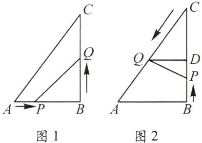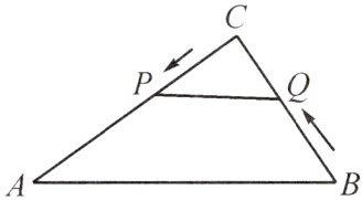 解:设经过$x$秒,点$P$移动到$BC$上,且有$CP = (14 - x)\ cm$,点$Q$移动到$CA$上,且使$CQ = (2x - 8)\ cm$,过$Q$作$QD \perp CB$,垂足为$D$,