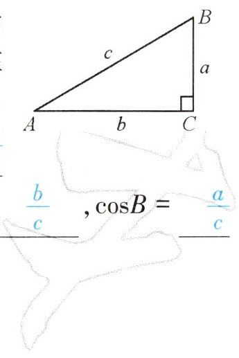$\cos B=\frac{邻边}{斜边}=\frac{BC}{AB}=\frac{a}{c}$