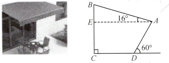 解:如图,过点A作AF⊥CD,交CD的延长线于F, 则四边形AECF为矩形, ∴AE=CF,CE=AF, 在Rt△AEB中,AB=5米,∠BAE=16°, 则BE=AB·sin∠BAE≈5×0.28=1.4(米),AE=AB·cos∠BAE≈5×0.96=4.8(米), ∴CE=BC - BE=4 - 1.4=2.6(米), ∴AF=CE=2.6米,CF=AE=4.8米, 在Rt△AFD中,AF=2.6米,∠ADF=60°, 则DF=AF/tan∠ADF≈2.6/1.7≈1.53(米), ∴CD=CF - DF=4.8 - 1.53≈3.3(米),