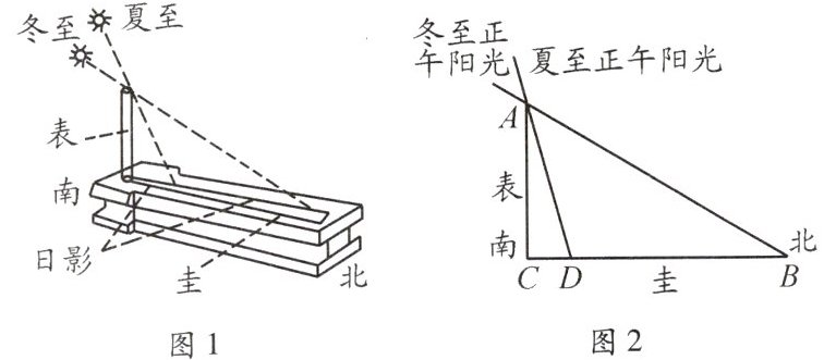 例3 圭表(如图1)是我国古代一种通过测量正午日影长度来推定节气的天文仪器,它包括一根直立的标杆(称为“表”)和一把呈南北方向水平固定摆放的与标杆垂直的长尺(称为“圭”),当正午太阳照射在表上时,日影便会投影在圭面上,圭面上日影长度最长的那一天定为冬至,日影长度最短的那一天定为夏至.图2是一个根据某市地理位置设计的圭表平面示意图,表AC垂直圭BC,已知该市冬至正午太阳高度角(即∠ABC)为35°,夏至正午太阳高度角(即∠ADC)为80°,表AC的长为3.5米.求圭面上冬至线与夏至线之间的距离BD的长.(结果精确到0.1米;参考数据:sin35°≈0.57,cos35°≈0.81,tan35°≈0.70,sin80°≈0.98,cos80°≈0.17,tan80°≈5.60)