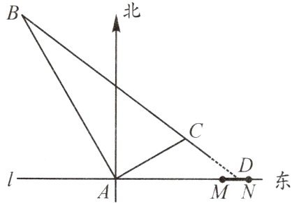 解:(1)12√7(km/n) (2)延长BC交直线MN于点D,设∠BDA=α 则tan∠BCA=tan(30°+α) ∴ S/√3=(√3/3 + tanα)/(1 - √3/3 tanα) ∴tanα=√3/2 ∴ED=8 ∴可以