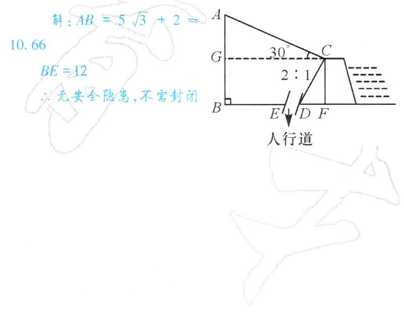 例2 如图,欲拆除一电线杆AB,已知在与电线杆AB水平距离14 m的D处有大坝,背水坡CD的坡度i=2:1,坝高CF为2 m,在坝顶C处测电线杆顶的仰角为30°,D,E之间是宽度为2 m的人行道. 试问:在拆除电线杆AB时,为确保行人安全是否需要将此人行道封闭?并说明你的理由.(在地面上以B为圆心,以AB为半径的圆形区域为危险区域,$\sqrt{3}≈1.732,$$\sqrt{2}≈1.414)$