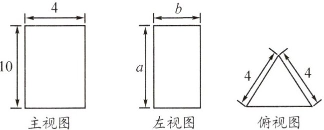 俯视图已给出为等腰三角形,两腰长为4。根据主视图和左视图,该几何体为一个棱台,上底面是等腰三角形(两腰为4),下底面是长为4、宽为$b$(左视图宽度$b$应与主视图宽度一致,即$b = 4$),高度为$a$($a=10$)。