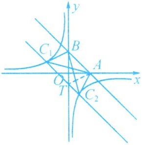 则$BT = 2 - (-1) = 3$,∴$S_{\triangle ABT} = \frac{1}{2} × BT × OA = \frac{1}{2} × 3 × 2 = 3$,过点T作直线AB的平行线交反比例函数$y = -\frac{2}{x}$的图象于点C,则$S_{\triangle ABC} = S_{\triangle ABT} = 3$,设直线CT的解析式为$y = -x + d$,则$d = -1$,∴直线CT的解析式为$y = -x - 1$,联立得$\begin{cases}y = -x - 1 \\ y = -\frac{2}{x}\end{cases}$,解得:$\begin{cases}x_1 = -2 \\ y_1 = 1\end{cases}$,$\begin{cases}x_2 = 1 \\ y_2 = -2\end{cases}$,∴点C的坐标为(-2,1)或(1,-2)。