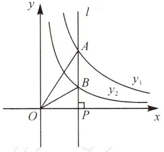 3. 如图,直线$l \perp x$轴于点P,且与反比例函数$y_1 = \frac{k_1}{x}(x > 0)$和$y_2 = \frac{k_2}{x}(x > 0)$的图象分别交于点A,B,连接OA,OB。已知$\triangle OAB$的面积为2,则$k_1 - k_2 = $