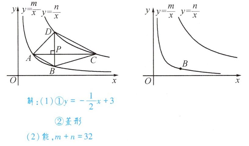 解:(1)①$y = -\frac{1}{2}x + 3$ ②菱形 (2)能,$m + n = 32$