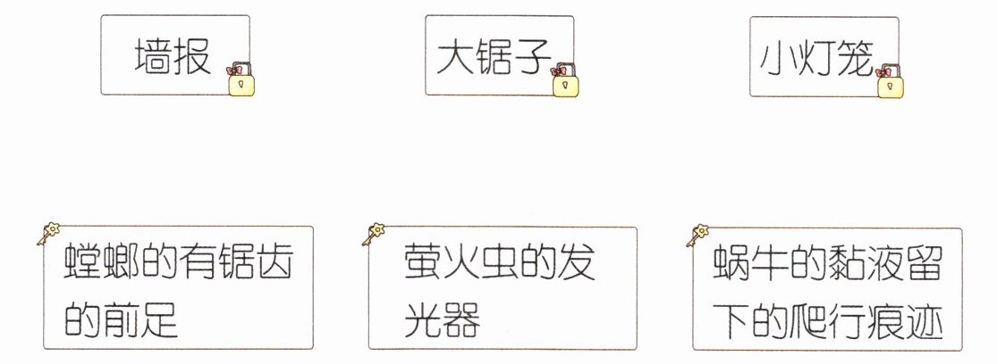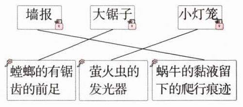 “三段式”解析 第一步:明考点,知考向 理解关键内容 第二步:学方法,理思路 根据题干所指,找到相关内容所在位置,联系生活实际,理解关键内容。 根据“墙报”定位到第一部分中的“而那小小的蜗牛,却默默地在古老而阴湿的城垣上不断地书写着‘墙报’”,联系生活中看到的蜗牛爬过的痕迹可知,“墙报”实际指蜗牛的黏液留下的痕迹。根据“大锯子”定位到第二部分中的“螳螂二话不说,就操起了两把大锯子,‘吱嘎吱嘎’地为她赶做嫁妆”,联系生活中见过的螳螂的样子可知,“大锯子”实际指螳螂的有锯齿的前足。根据“小灯笼”定位到第三部分中的“用小灯笼一闪一亮地发光发热”,联系生活中了解到的有关萤火虫的知识可知,萤火虫腹部末端的下方有发光器,由此可知,“小灯笼”实际指萤火虫的发光器。据此连线。 第三步:做订正,养习惯 红笔订正,总结答题方法。 4. (示例)青蛙 穿着带花纹的绿衣裳,露着白肚皮