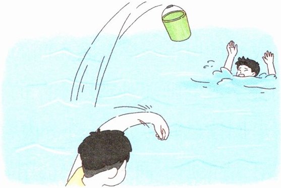 远距离救援时,可以将空水桶、泡沫板、塑料瓶等抛向溺水者,帮助溺水者借物漂浮在水面上等待救援。