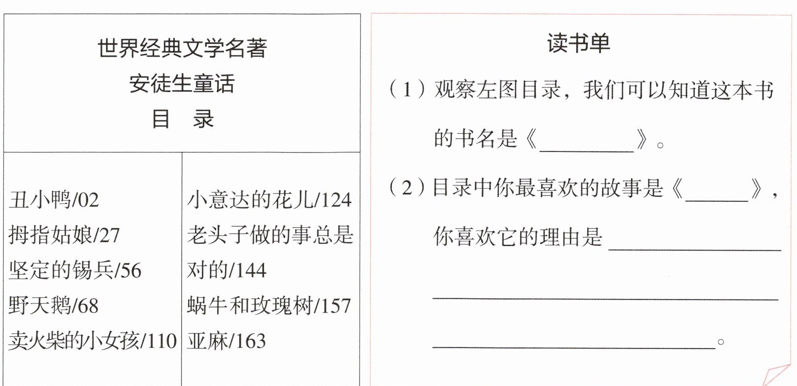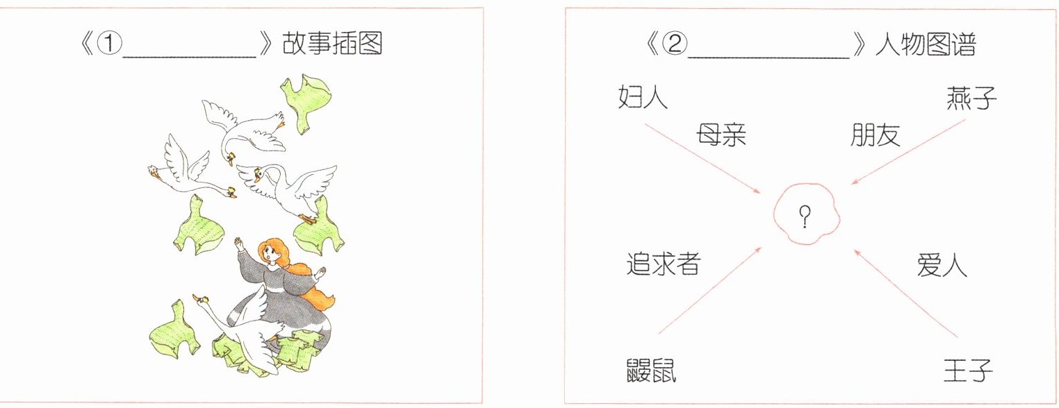 8.三年级(1)班将要开展“漫步童话花园”阅读活动。小本和依依根据各自阅读的收获,分别制作了两张阅读卡,请你根据阅读卡里的内容把故事名称补充上。