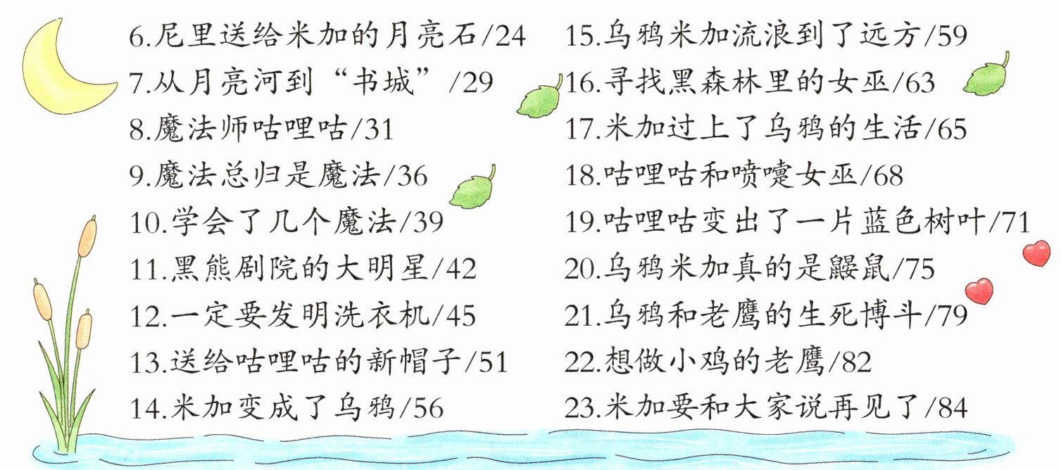 1. C 2. 答案 C “三段式”解析 第一步:明考点,知考向 推断 第二步:学方法,理思路 根据题干所指,结合材料内容和目录,抓住关键信息,进行推测。 【材料四】讲述了鼹鼠米加在黑熊剧院成功表演了“纸片变树叶”的节目,并且受到了记者鹦鹉小姐的采访,在镜头里的米加像是一个大明星,黑熊先生也说他会成为明星。据此可以推测【材料四】出自《黑熊剧院的大明星》这一章节。 第三步:做订正,养习惯 红笔订正,总结答题方法。 3. 答案(示例1)《魔法师咕哩咕》 米加机缘巧合之下认识了魔法师咕哩咕,并爱上了魔法,于是想要拜咕哩咕为师 (示例2)《米加变成了乌鸦》 米加因为魔法失灵变成了一只乌鸦,飞向远方了 “三段式”解析 第一步:明考点,知考向 预测(指向三上语文要素) 第二步:学方法,理思路 根据题干所指,结合材料内容和目录,发挥想象,进行预测。 选择感兴趣的章节,根据章节名称、上下章节名称的联系,以及【材料二】对故事的介绍,预测章节的内容。如对《想做小鸡的老鹰》感兴趣,这个章节可能写了一只被魔法变成小鸡的老鹰,认为做小鸡很开心,他请求咕哩咕让魔法永远消失,不想再变回老鹰了。 第三步:做订正,养习惯 红笔订正,总结答题方法。 4. ①米加的魔法表演很成功,真的把纸片变成了树叶 ②没有人想到鼹鼠也会变魔法 5. (示例)惊讶 米加的爸爸希望米加成为一名挖掘专家,但是现在米加却学会了魔法,成了一名魔法师 6. (示例1)米加是一只特立独行、坚持追求自己爱好的小鼹鼠。他不喜欢家族的本职工作——挖掘,而是喜欢发明与创造,于是离开了家乡去实现发明一台洗衣机的梦想。 (示例2)米加是一只细心严谨的小鼹鼠。他在黑熊剧院给观众表演魔法时没有出错,还赢得了大家的好评。 评分标准:答出米加的特点,得2分;结合具体情节分析形象特点,言之有理,得2分。