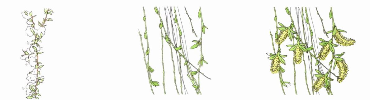 杨柳,随处可种,临¹水尤²宜。春初发叶,旋开黄花。及³春末,叶渐多。花中结实,细而黑。蕊落,有絮绽出,质软如棉,色白如雪,随风飞舞,散于各处。