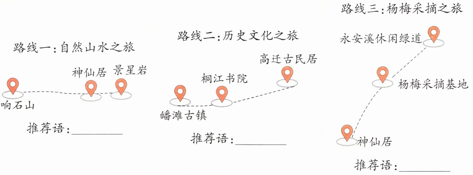 1.整体感知【材料三】中的三条路线各有特点,请你为这三条路线选择合适的推荐语,填在【材料三】中的横线上。(填序号)(3分)