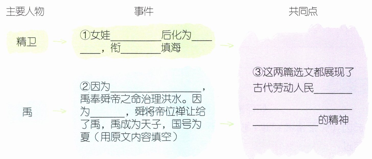 1. ①溺水身亡(或“死”) 精卫 木石 ②洪水为患,民无安居之所 有大功(或“舜以禹有大功”) ③勇于征服自然、改造自然