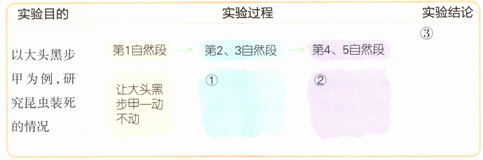 1. ①放表来记录大头黑步甲的静卧时间并观察其静卧状态 ②观察大头黑步甲“复活”后的反应,并进行多次实验 ③昆虫连续装死时,每一次的持续时间都不相同,长短不一