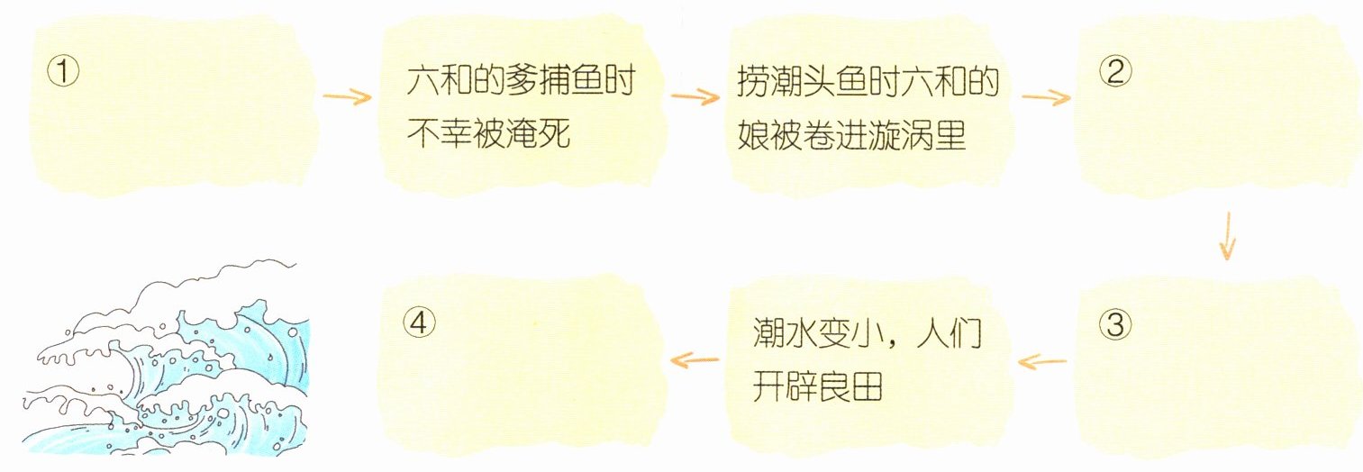 有一天,娘儿俩正在捞鱼的时候,潮水来得特别快、特别凶。六和看着势头不妙,想牵住娘的手拔腿飞跑,可是一个浪头打来,把他娘卷进漩涡里了。