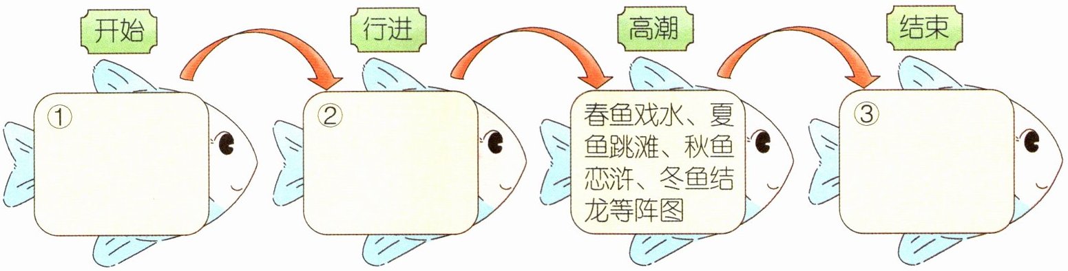(1)答案 舞蹈阵图 美好寓意 “三段式”解析 第一步:明考点,知考向 概括主要内容 第二步:学方法,理思路 阅读文章内容,抓住关键语句,用简洁的语言进行概括。 阅读第2自然段可知,这一自然段主要讲述了青田鱼灯舞的来源和历史演变;阅读第3自然段中的“以长柄大红珠领队,举红珠者口吹哨子,指挥灯舞”“鱼灯表演时,以‘红珠’领队,每人手举一盏鱼灯,走各种阵图”等内容可知,此处主要讲述了青田鱼灯舞的表演形式;阅读第4自然段的第一句话可知,此处主要讲述了青田鱼灯舞的舞蹈阵图;由第3自然段中的“表达人们对美好生活的追求和向往,体现吉祥如意、连年有余(鱼)、风调雨顺、国泰民安的美好愿望”和第4自然段中的“寓意鲤鱼化龙,青云直上,表达了人民对美好生活的向往”可知,文章还讲述了青田鱼灯舞的美好寓意。据此填空即可。 第三步:做订正,养习惯 红笔订正,总结答题方法。