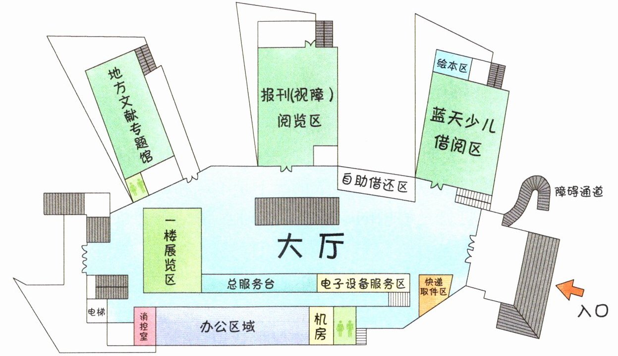 图书馆共有三层,分别为一层、二层及地下一层,设有地方文献专题馆、社会科学文献借阅区等功能区。下面是图书馆一层平面示意图: