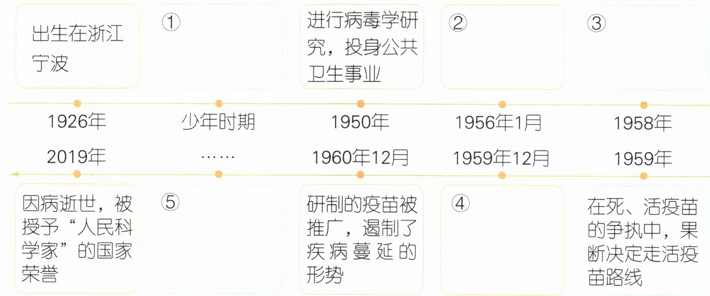 1. 答案 ①5岁时父亲因病去世,在母亲的教育和影响下,立志做一个对社会有用的人 ②留学归国,临危受命研制疫苗 ③带领小组分离出脊髓灰质炎病毒且成功定型 ④担任脊灰活疫苗研究协作组组长,进行疫苗研究工作 ⑤将液体疫苗改成糖丸,让更多农村孩子受益,被称为“糖丸爷爷” ⑥时间