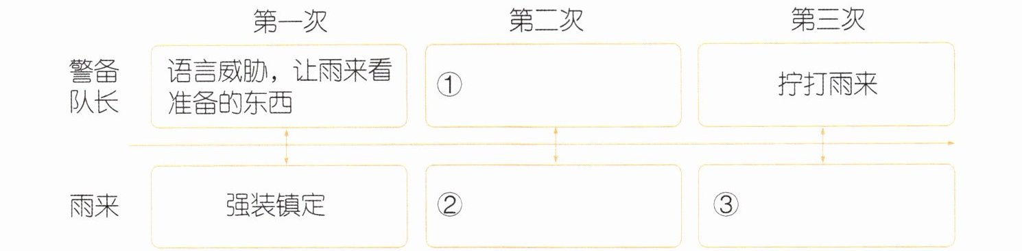 1.整体感知 文中运用大量篇幅写了雨来和警备队长的三次“交锋”,请你根据文章内容,完成下面的框图。(3分)