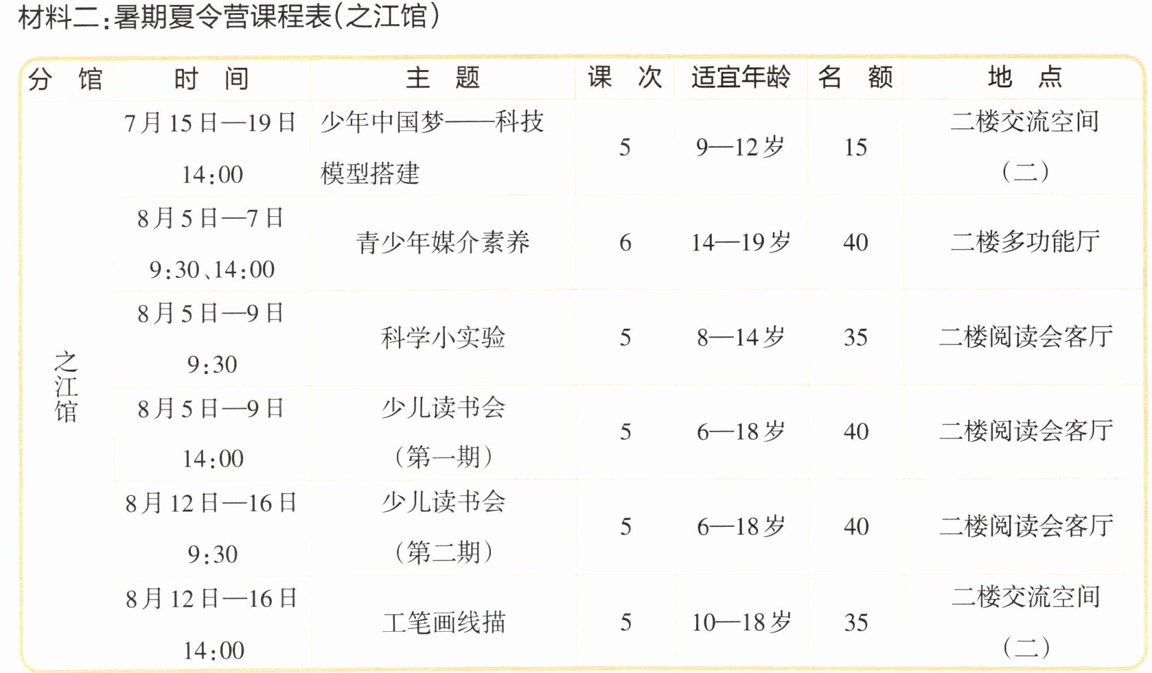 (4)之江馆的暑期夏令营课程地点都在图书馆二楼进行,其中,“科学小实验”所需要的工具和材料费用由学员自理。 ( )