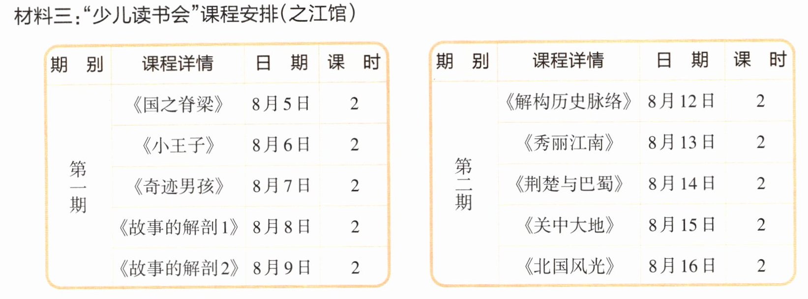 (3)“少儿读书会”一共开设5天的课程,每天一节课,每节课两个课时,在图书馆二楼阅读会客厅进行,课程无材料费用。 ( )