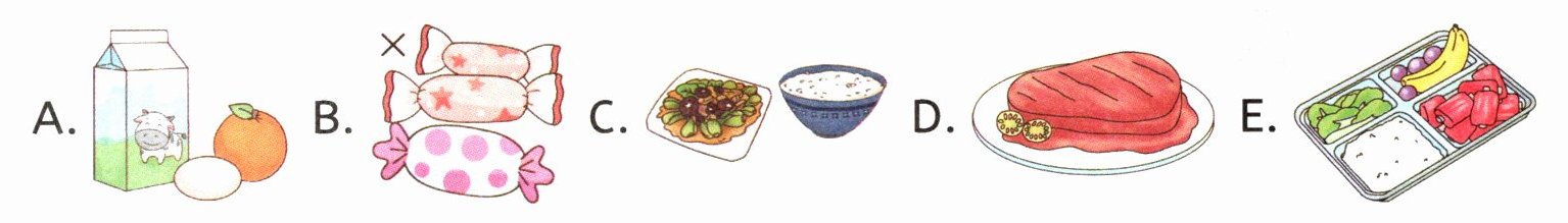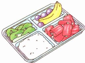 Hi, I'm Nancy. This is my healthy plate. I often have some 1. ________(rice/noodles) and some 2. ________(chicken/meat) for lunch. I have some green 3. ________(vegetables/soup) too. I like fruit. I have some 4. ________(grapes/apples) and a banana after lunch.