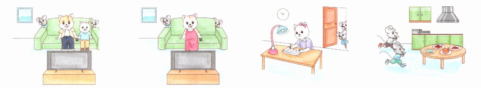 One day, two mice are very hungry. They look for food everywhere. They come into Mr Cat's house. Father Cat and the little cat are in the living room. They're watching TV. Mother Cat is washing clothes in the bathroom. Sister Cat is doing her homework in the study. So the two mice run to the kitchen quickly. They eat some delicious food there.