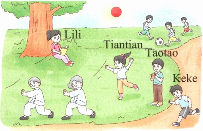 It's sunny today. There are many people in the park. Look! Lili is reading a book under the tree. Tiantian is dancing. Taotao is eating some bread. Keke is running.
