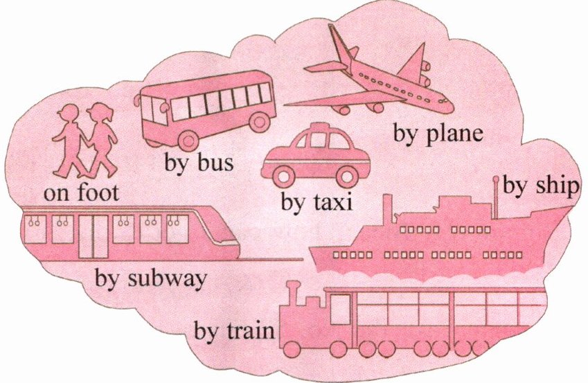 1. on foot 2. by plane 3. by taxi 4. by bus 5. by train