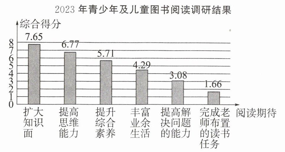 (1)从 2023 年青少年及儿童图书阅读调研结果来看,在不同的阅读期待中,“扩大知识面”的相关数值较高,而“完成老师布置的读书任务”的相关数值较低。