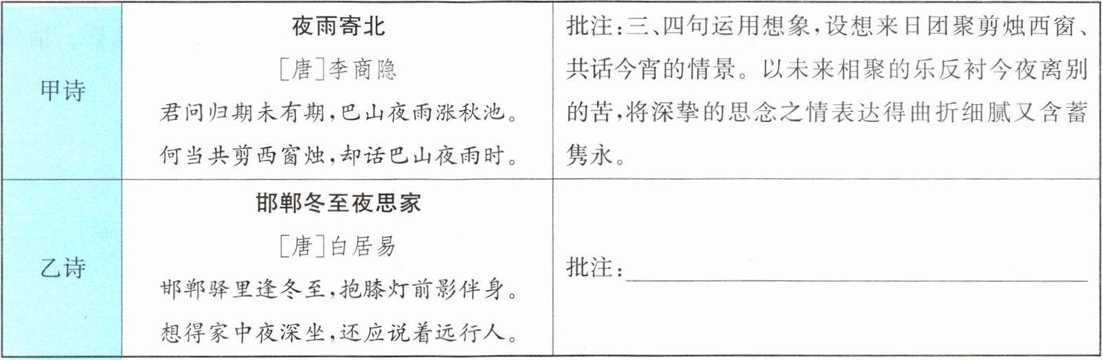 (2)仿照《夜雨寄北》的批注,为《邯郸冬至夜思家》一诗的三、四句作批注。