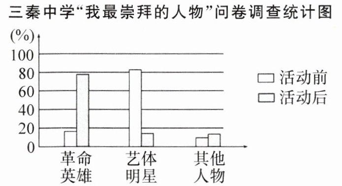 (3)示例:活动前,对艺体明星的崇拜比例高于革命英雄;活动后,对革命英雄的崇拜比例高于艺体明星。对其他人物的崇拜比例变化不大。