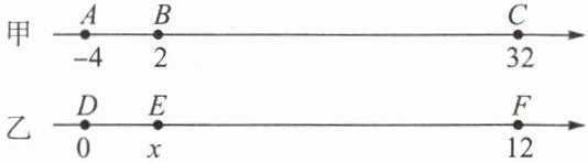 【例3】(河北中考题)如图,有甲、乙两条数轴.甲数轴上的三点A,B,C所对应的数依次为-4,2,32,乙数轴上的三点D,E,F所对应的数依次为0,x,12.