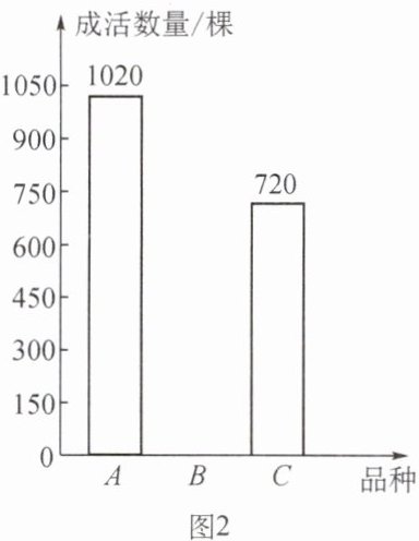 (2) $ B $ 品种树苗成活棵数为 $ 3000 × 89\% - 1020 - 720 = 930 $(棵)。补全条形统计图如图所示: