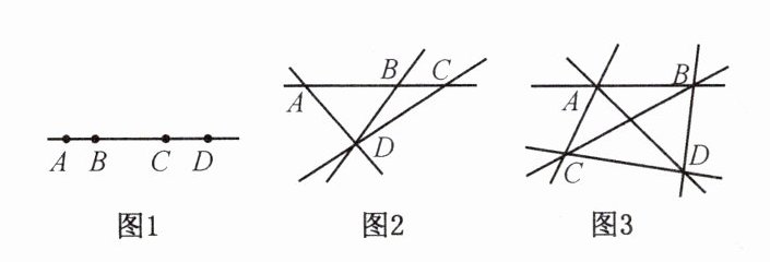 【解析】:分三种情况讨论平面内四个点$A$,$B$,$C$,$D$确定直线的数量,分别是四个点在同一直线、三个点在同一直线另一点在外、任意三点都不在同一直线。