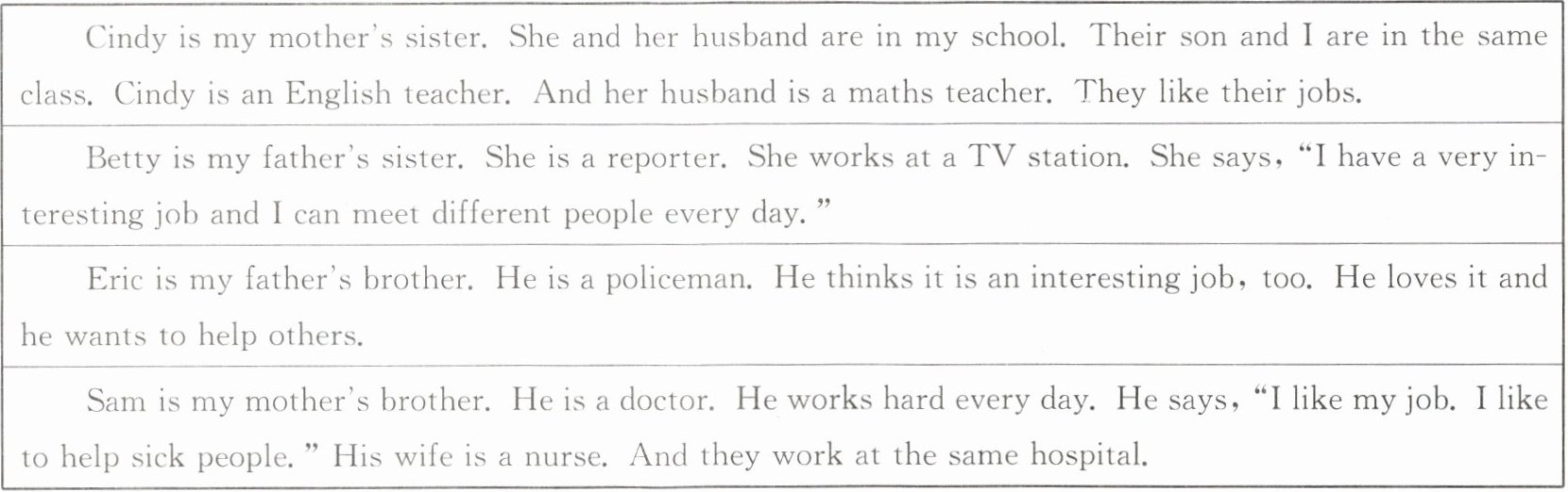 Cindy is my mother's sister. She and her husband are in my school. Their son and I are in the same class. Cindy is an English teacher. And her husband is a maths teacher. They like their jobs.