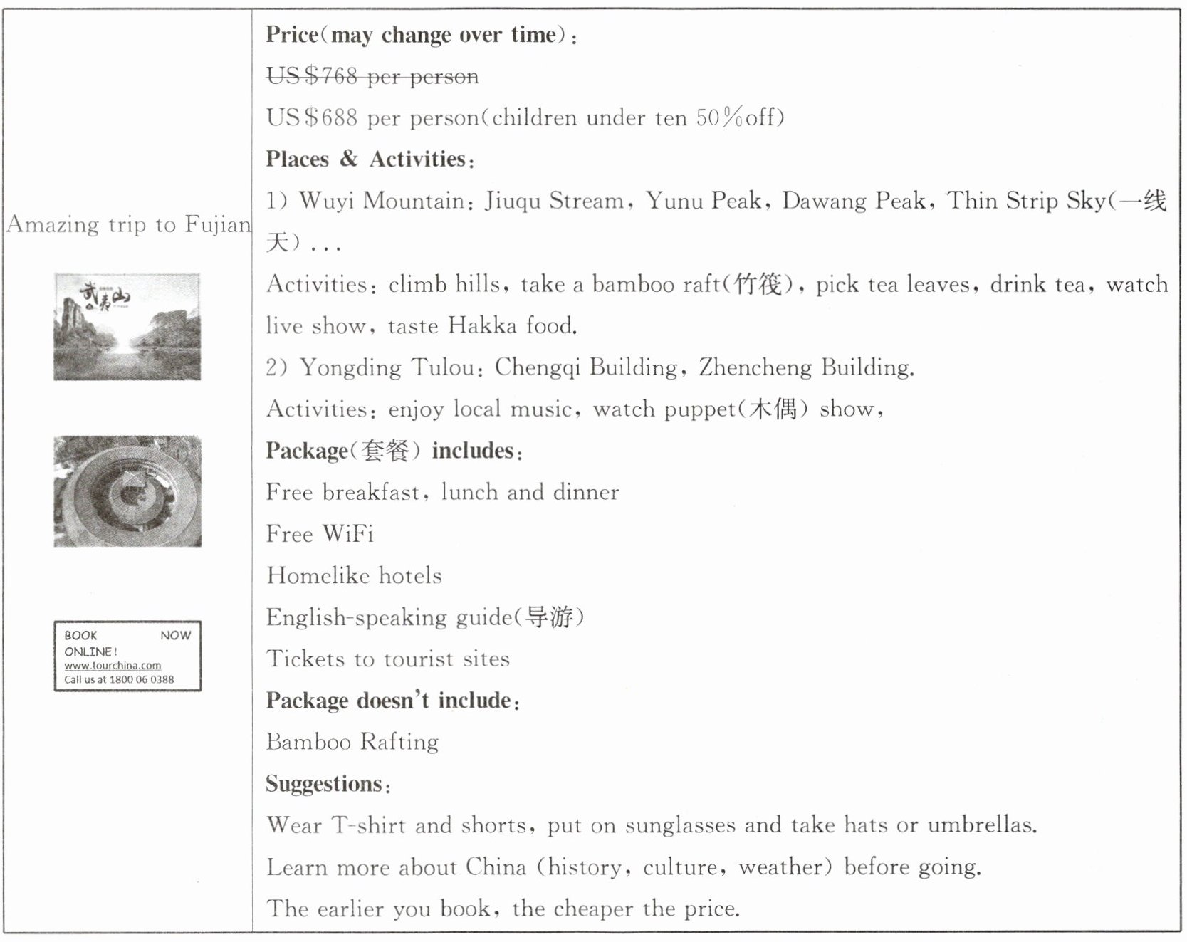 Linda is an American student in Grade 7. The summer holidays are coming. Her parents want to take her to visit Fujian, China. Now she is reading the website of an international travel agency(旅行社).
