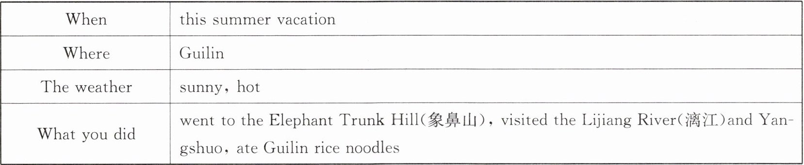 Now let me tell you something about my trip. This summer vacation, I went to Guilin with my family. The weather was sunny and hot. First, we went to the Elephant Trunk Hill. It was wonder-ful. After that, we visited the Lijiang River. The water was clean and cool. Then we visited Yang-shuo, too. It was beautiful. We took a lot of pho-tos and had a lot of fun. We also ate Guilin rice noodles. They were very delicious. We stayed there for three days. We had a wonderful time.