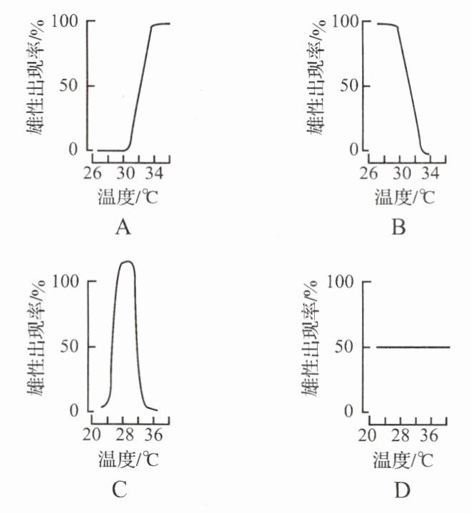 18. 有些动物的性别分化受温度影响。如图所示是四种爬行动物的卵在不同温度下发育成雌雄个体的比例,其中能表示雄性仅出现在某个很狭窄的温度范围内,而高于或低于此温度范围则出现雌性的是()